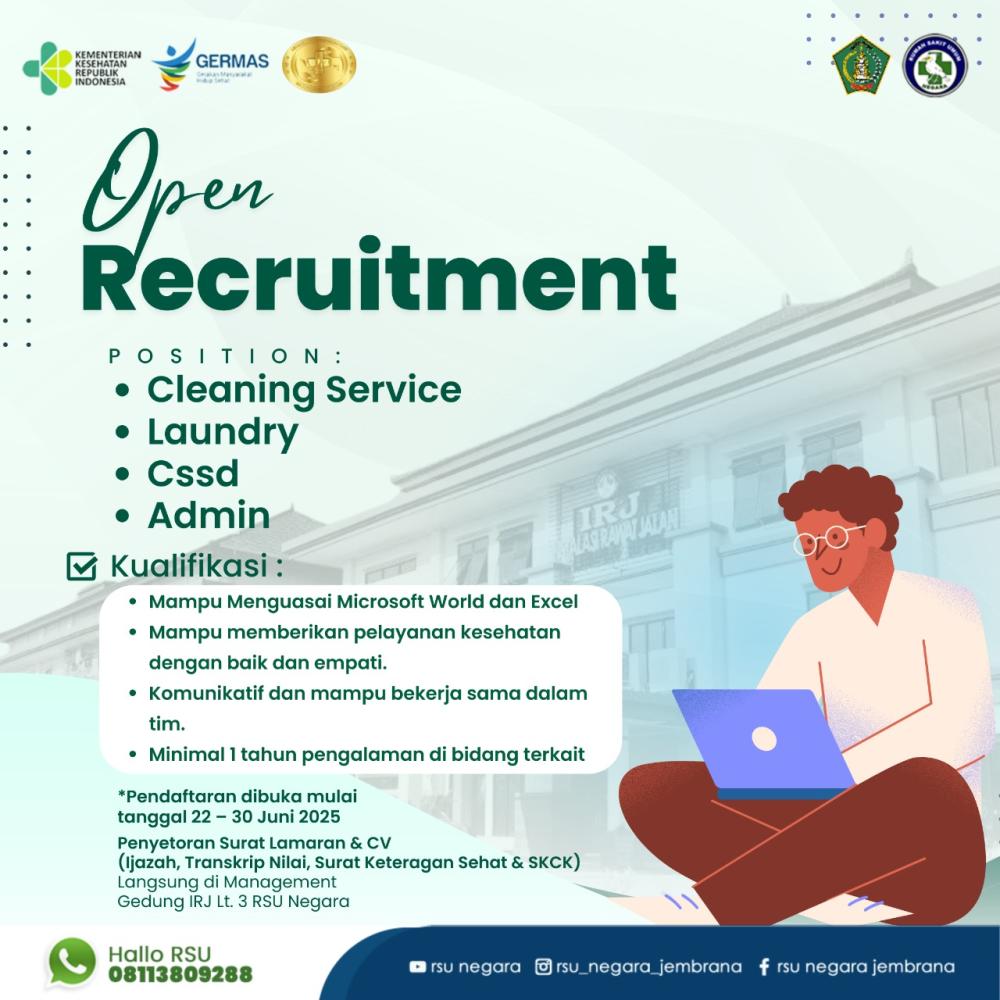 Jembrana – Rumah Sakit Umum Negara kembali membuka lowongan kerja bagi masyarakat yang ingin bergabung sebagai bagian dari tim pendukung layanan kesehatan. Melalui program Open Recruitment ini, RSU Negara membuka kesempatan untuk empat posisi, yaitu: